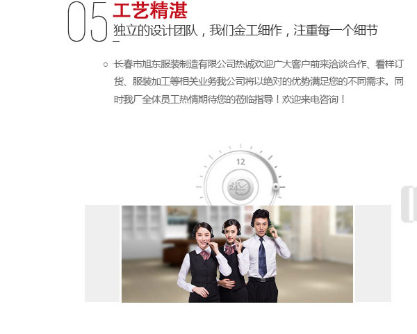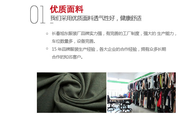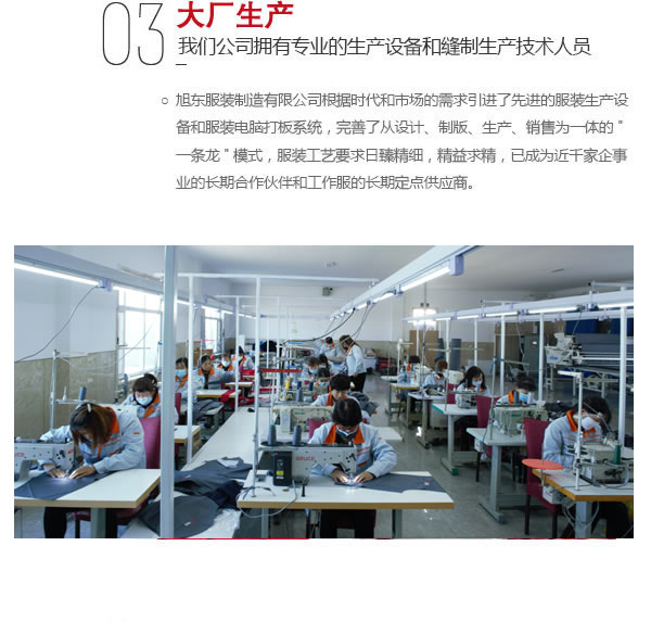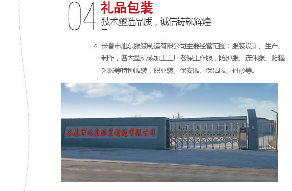 吉林省長(zhǎng)春市旭東服裝廠,電話:13578777918,提供工作服,工裝定制,勞保服,保安服,職業(yè)裝定制,本公司是一家集生產(chǎn),設(shè)計(jì),制作,銷售為一體的多元化公司。長(zhǎng)春市旭東服裝制造有限公司成立于2003...[查看更多]