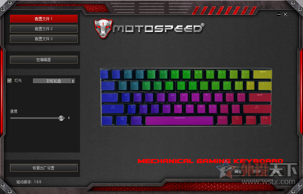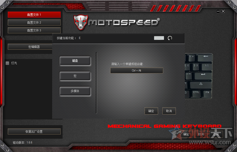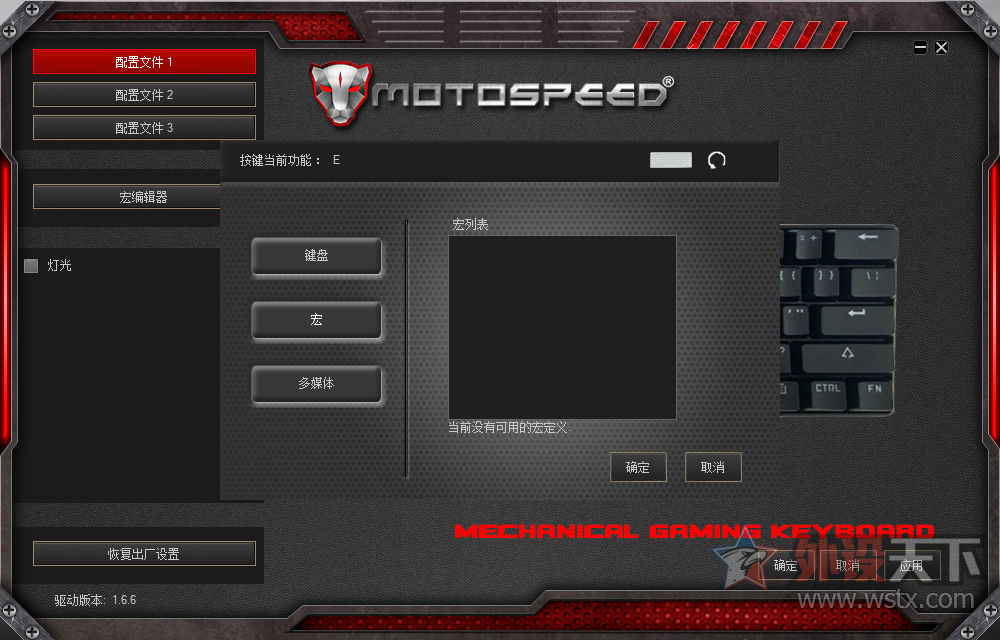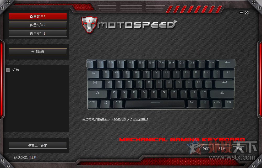 這把鍵盤可以配置3組文件,通過驅動我們可以為鍵盤的每一個按鍵設置單獨的功能。