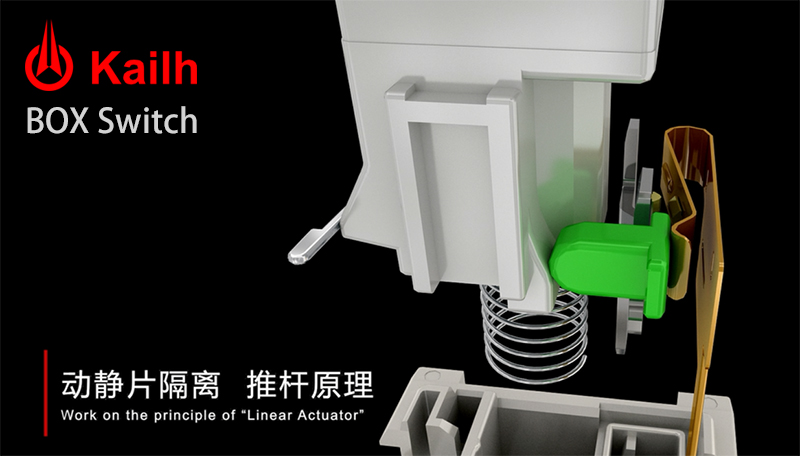 凱華Kailh是中國最早做機械鍵盤開關研發的公司,經過幾年的技術累積,在軸體開關上逐漸有了自己的理解,公司在經過努力后,成功研發出屬于中國人的軸體技術—“BOX技術”。正如其名一樣,BOX技術是用盒子的形式包裝觸發彈簧片,通過凸出的”小綠點“觸碰彈簧片,而不是MX技術的擠壓形式,可以大大的減少彈簧片的變形,增加軸體的壽命,以及保持軸體按擊的聲音。