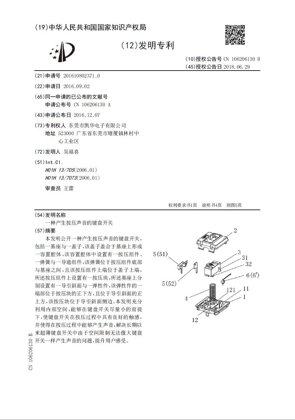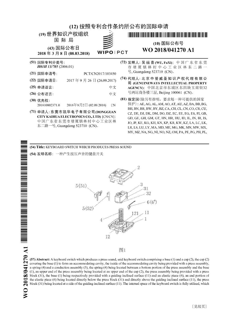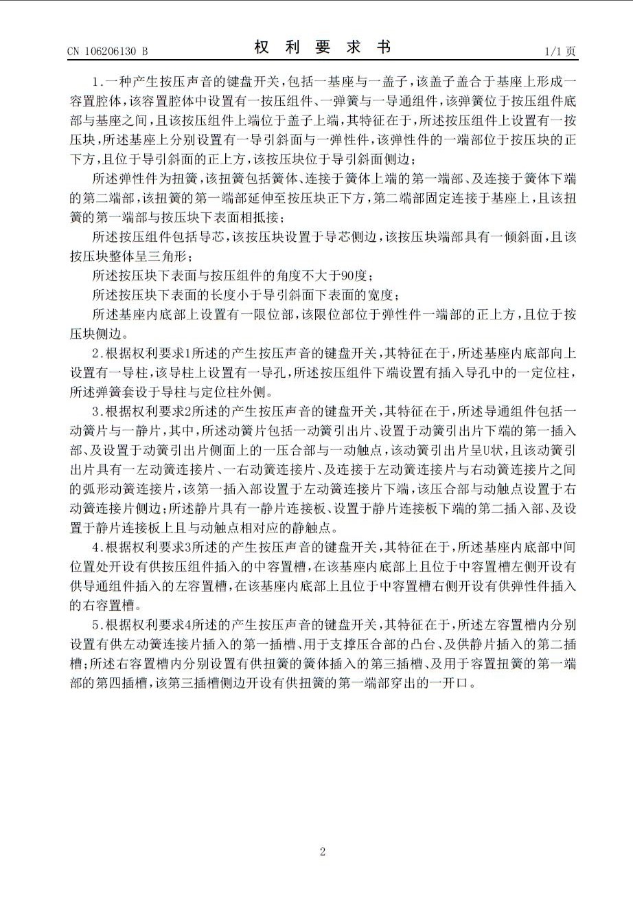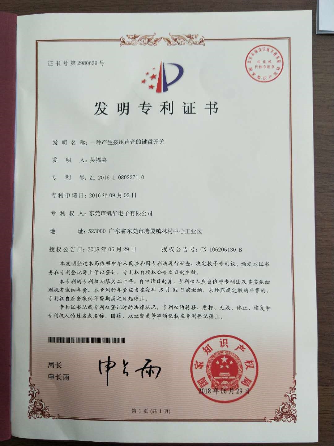 東莞市凱華電子有限公司在此嚴正聲明,《一種產生按壓聲音的鍵盤開關》,專利號:201610802371 .0為東莞市凱華電子有限公司經國家知識產權局專利局審定授權的發明專利。此專利技術廣泛應用于筆記本電腦鍵盤,超薄機械鍵盤上,因其結構合理,使得在機械鍵盤開關內部有限的空間內,扭簧敲擊鍵盤開關的位置固定,發出的聲音清脆,音質統一,獲得了廣大機械鍵盤用戶的青睞,在國內外市場上獲得用戶的認可。