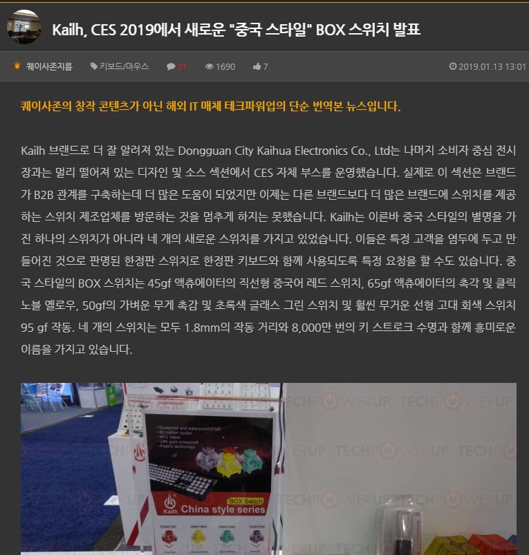 在亞洲以韓國為例,Kailh軸體在韓國的市場占有率和知名度還是相當不錯的,無論是韓國的網吧市場還是個體消費者,或者是韓國本土的外設品牌等等都能看的到Kailh的身影。本次CES展韓國媒體也有到凱華的展臺進行拍攝采訪,并在韓國本土發布了篇報道,引起韓國網友們的大量關注。