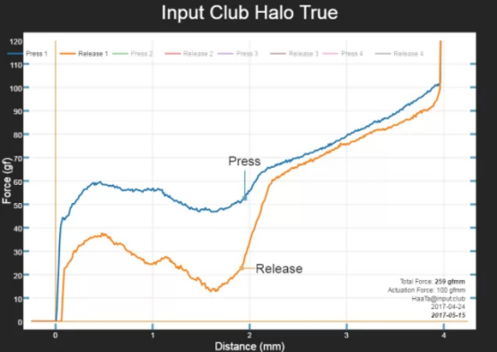 This switch will have a much more tactile keyfeel than the Halo True. The peak tactile force is at 65gf, and it dips all the way down to ~47-48gf just before actuation. Then, right at the actuation point, the force bumps up again to about 60gf.