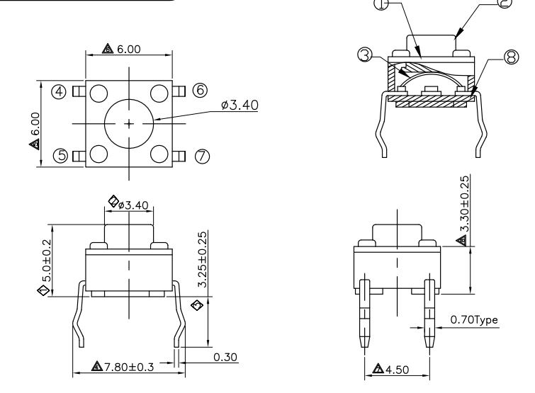 | CTA603201D01 | 6.0*6.0*4.3 | 觸動回復式 | 250±50gf | 0.25±0.10mm | 4 |