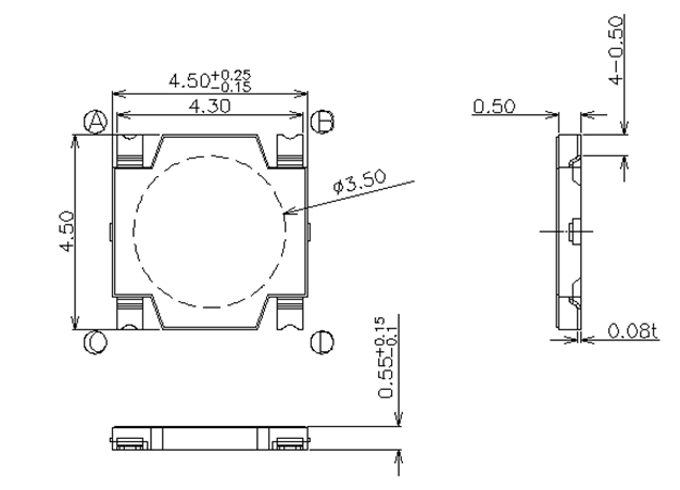 | CTA455501S01 | 4.5*4.5*0.55 | 觸動回復式 | 160±30gf | 0.2+0.1/-0.05mm | 4 | |||