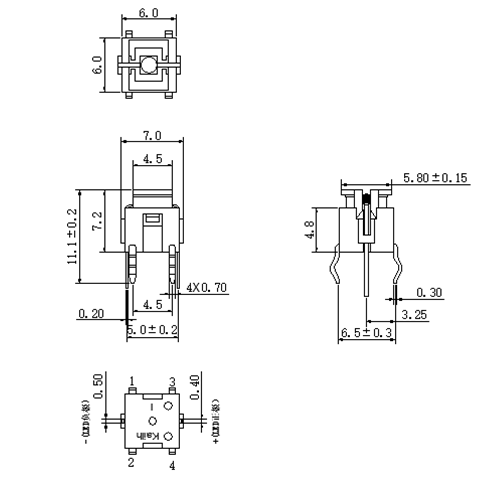 | CLA614801D04 | 6.10*6.10*7.0 | 觸動回復式 | 160±50gf | 0.25+0.05/-0.15mm | 6 | 綠燈 | ||||