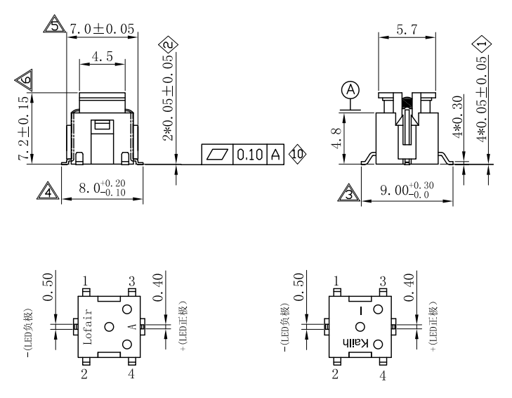 | CLA614801D04 | 6.10*6.10*7.0 | 觸動回復式 | 160±50gf | 0.25+0.05/-0.15mm | 6 | 綠燈 | ||||