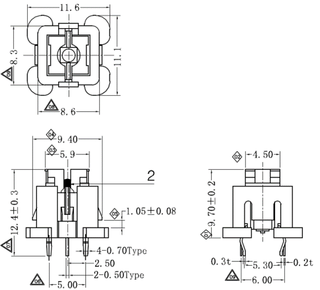 | CLA851101D09 | 9.5*8.5*12.4 | 觸動回復式 | 350±50gf | 1.20±0.3mm | 6 | 白燈 | 扇形帽子 | 號角符號 | ||